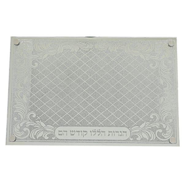 Chanukah Menorah Tray Tempered Glass -Metallic Look Silver “Haneiros Hallalu”13.5 x 9.5"
