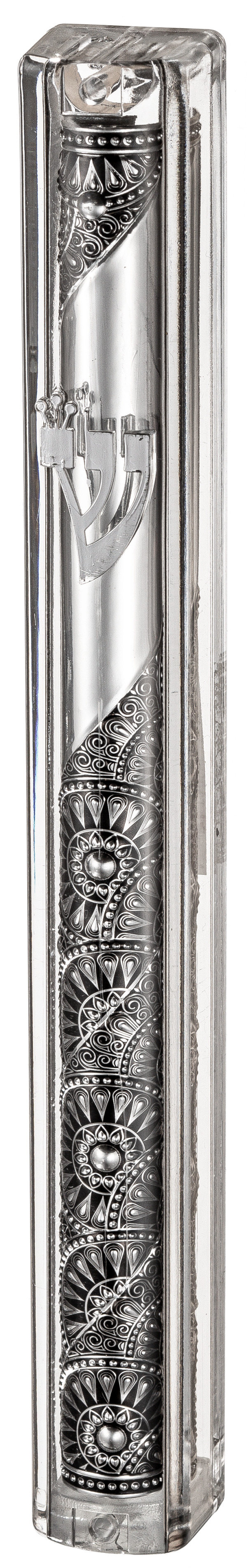 Transparent Plastic Mezuzah with Rubber Cork 12 cm- with the letter Shin and Plaque