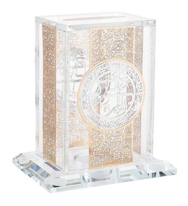 Crystal Tzedakah Holder with Gold Plates 4.5x3x3"