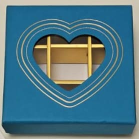 Blue Chocolate box divided into 9 with a transparent window in a heart pattern