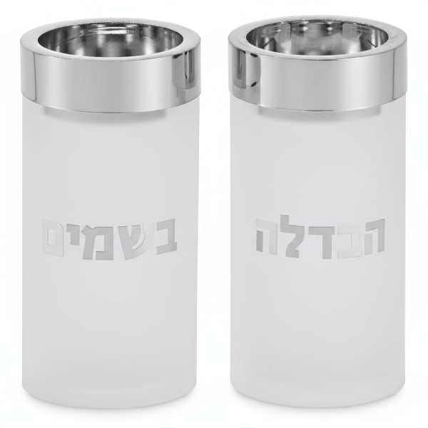 This elegant two-piece Havdalah and Besamim set features frosted acrylic containers with luxurious Silver lids and Hebrew lettering.