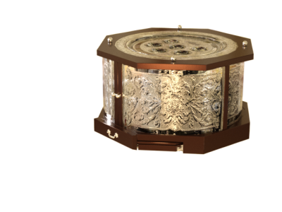 Deluxe 3-tier silver/mahogany Kaarah with retractable Shtender for your Hagadah.