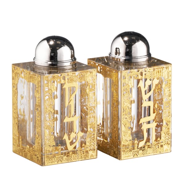 Salt And Pepper Set Gold Jerusalem Shabbat 3"HX1.5"
