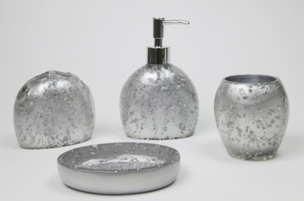 Bathroom Accessories Set Silver tumbler 3.5" lotion dispenser 6.5" bar soap dish 3.5" toothbrush holder 3.75"