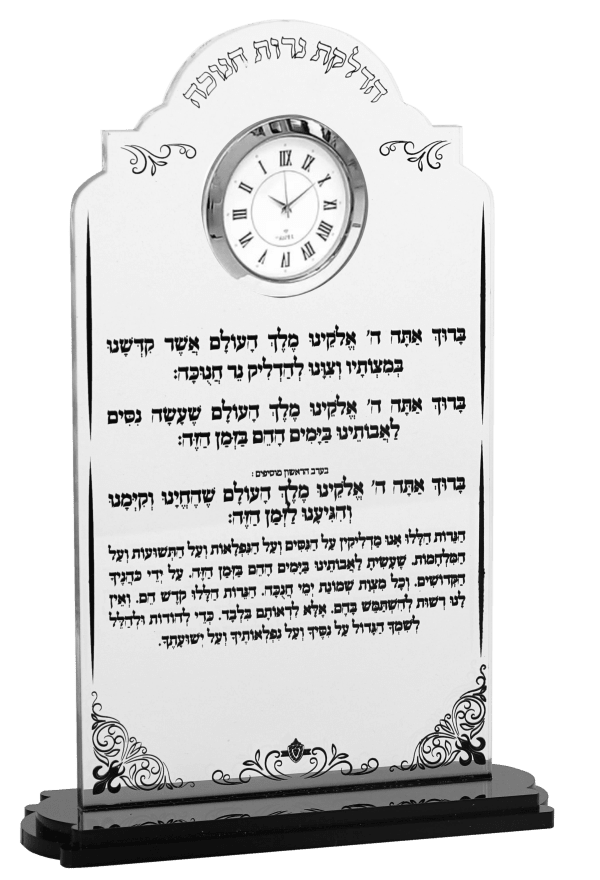 Acrylic Chanukah Brachot Stand With Silver Clock Black Print 8.5x5.5"